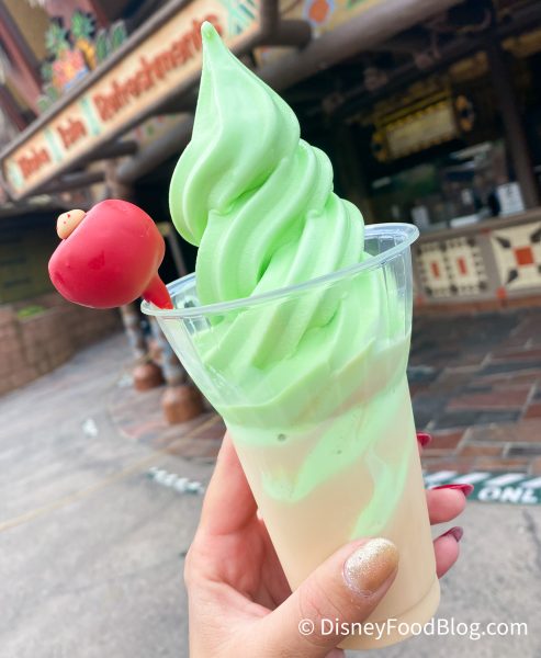 And, the Pistachio Chai Tea Float at Aloha Isle might look festive, but we weren’t too sure about how all its ingredients would work when they were mixed together. Disney has, after all, have a long-standing fascination with pistachio-flavored floats. Who else remembers the TOTALLY bizarre Cherry-Pistachio Float served over frozen hot chocolate from last Christmas?