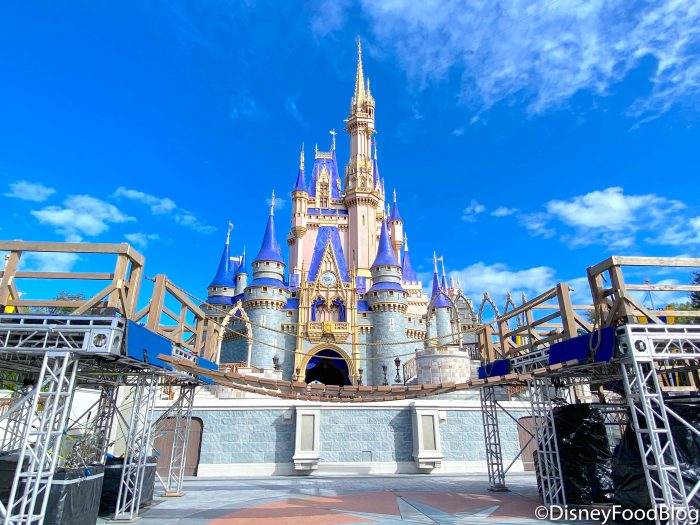 Recently, we spotted a stage built in front of Cinderella Castle where filming happened this past week. We may not be sure exactly what Disney was filming, but the stage was a bit on the wild side with a slide and a hanging bridge! However, the parks have updated the set to include rope handles along the bridge…