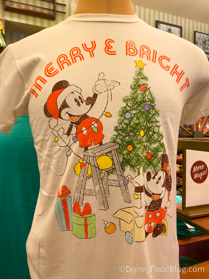 Can you believe it’s already Christmastime in Disney World as 2020 comes to a swift close? While we are SO ready to stuff our faces with turkey and gingerbread soon, we also can’t wait to wear some of the new holiday shirts we found in the Emporium as well. You can make each day “Merry and Bright” in this Mickey and Minnie Tee…