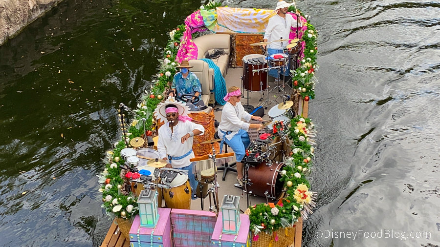 The holiday character cavalcades have arrived (referred to in this park as “flotillas!”). And the characters are wearing their holiday best! Although Pocahontas and Meeko, along with Rafiki and Timon, were the same, the drummers had festive new costumes and boat decor.