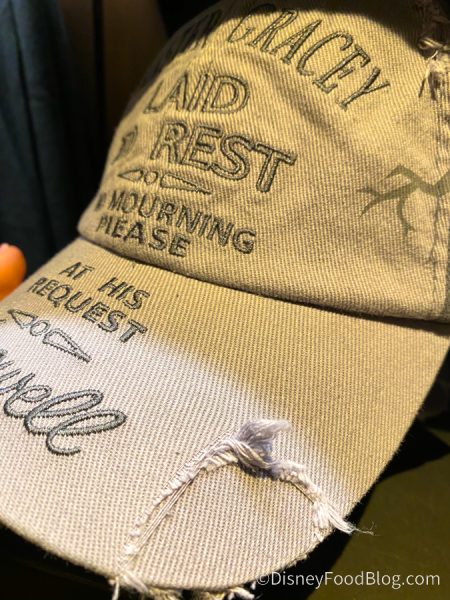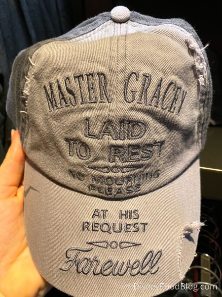 And we just spotted another super cool Haunted Mansion item at Disney World! This one is a tribute to the Master Gracey Tombstone in the Mansion’s graveyard — it’s a Haunted Mansion Master Gracey Cap! It’s got the epitaph from Master Gracey’s tombstone!