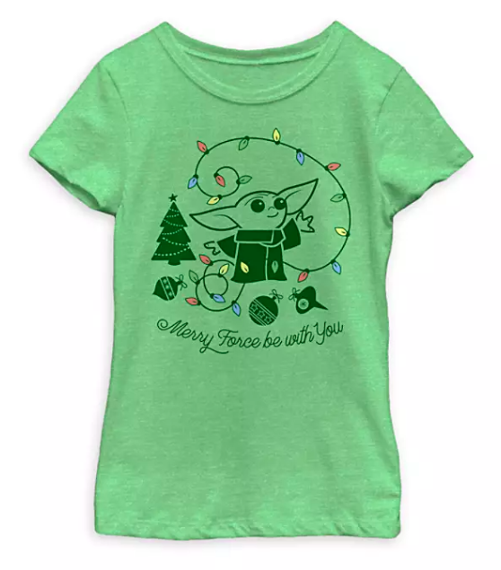 While many prefer red during the holidays, green lovers will enjoy this next shirt! The Child “Merry Force Be With You” T-Shirt is super cute! This features Baby Yoda decorating for the holidays with lights and ornaments!