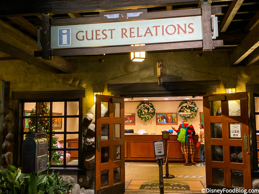 The inside of the Guest Relations area looks perfectly cheerful with wreaths hanging behind the desk and a Christmas tree in the window!