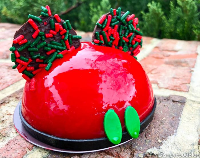 But, today we found a holiday dome cake we just HAD to try — it’s the NEW holiday version of the mini Mickey dome cake!