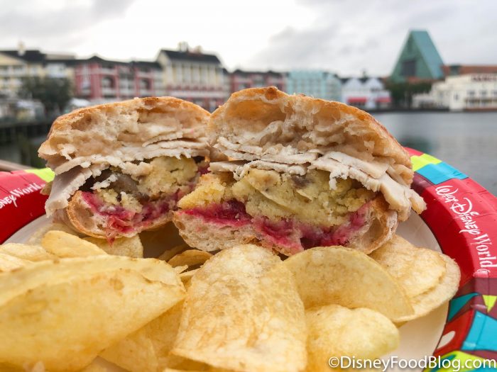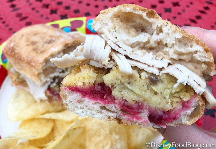 We’ve had the holiday sandwich over at Earl of Sandwich, and we JUST tried a sandwich at Fort Wilderness which has some similar ingredients to this one — so how did this sandwich hold up? We think the Gobbler Sandwich from BoardWalk Bakery is REALLY GOOD! The cranberry sauce is tangy and sweet, which compliments the stuffing and turkey very well.