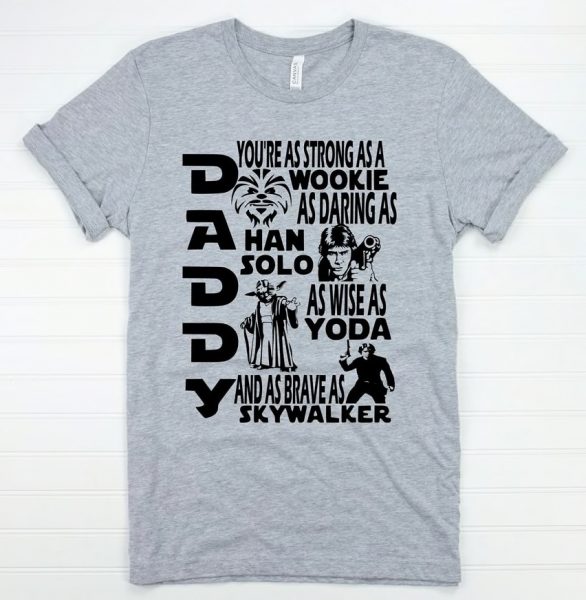 Last, but definitely, not least is this “Daddy” shirt design. Let’s be real, the Star Wars heroes have nothing on your father! He’s got the best qualities from ALL your favorite characters — he’s “as strong as a wookie, as daring as Han Solo, as wise as Yoda, and as brave as Skywalker” — and this t-shirt will make sure he never forgets it.