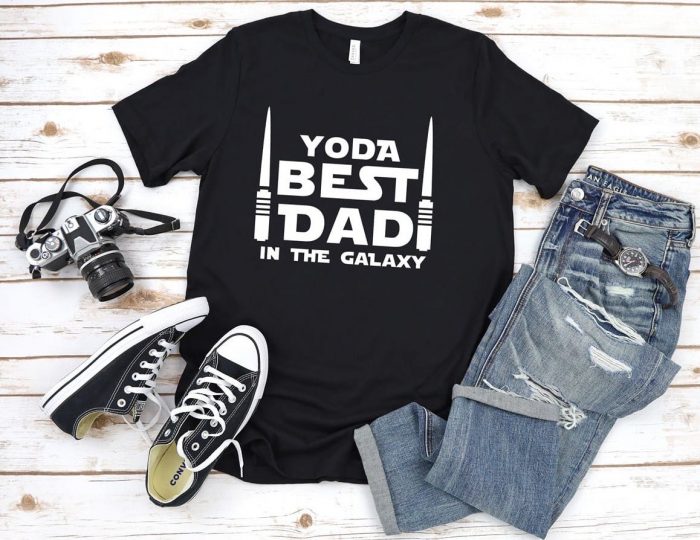 If your dad is strong with the Force, you can get him this shirt that says “Yoda Best Dad in the Galaxy” with two lightsaber-type icons on the sides.