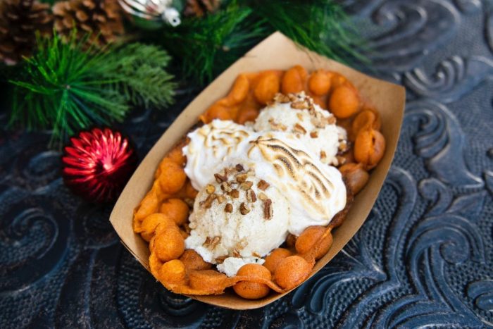 This new item features vanilla ice cream, toasted marshmallow, candied pecans, caramel sauce, and cinnamon! All of these sweet toppings come on top of a sweet potato bubble waffle!