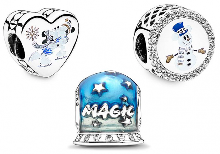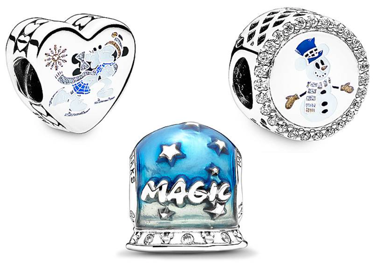 On the first charm, Mickey and Minnie share a smooch while skating. The second features a Fantasyland Castle on blue enamel. The third has a sweet little Mickey snowman, complete with blue enamel top hat!