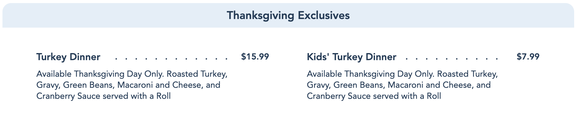 Yum! Those offerings sure do sound tasty! Keep in mind that you can only snag these meals on Thanksgiving Day so they’re a great way to get that special meal in while you’re in Magic Kingdom.