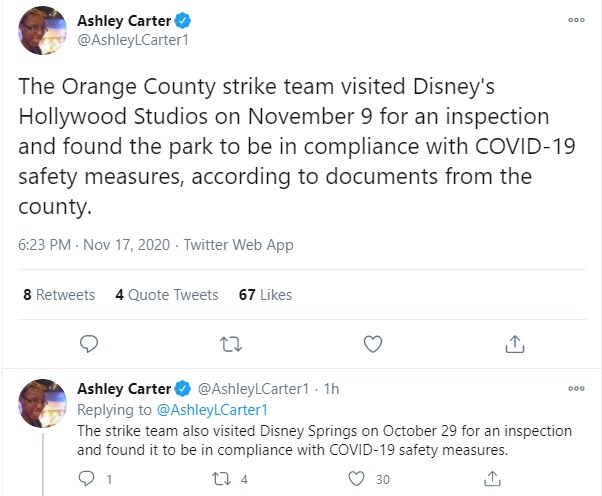 According to Carter, both Hollywood Studios and Disney Springs were found “to be in compliance with COVID-19 safety measures, according to documents from the county.”
