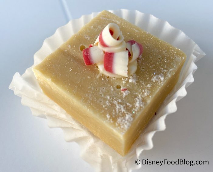 We’re kicking things off with the White Chocolate Peppermint Fudge. This one tastes exactly like a candy cane and even comes with a small red and white embellishment on top!