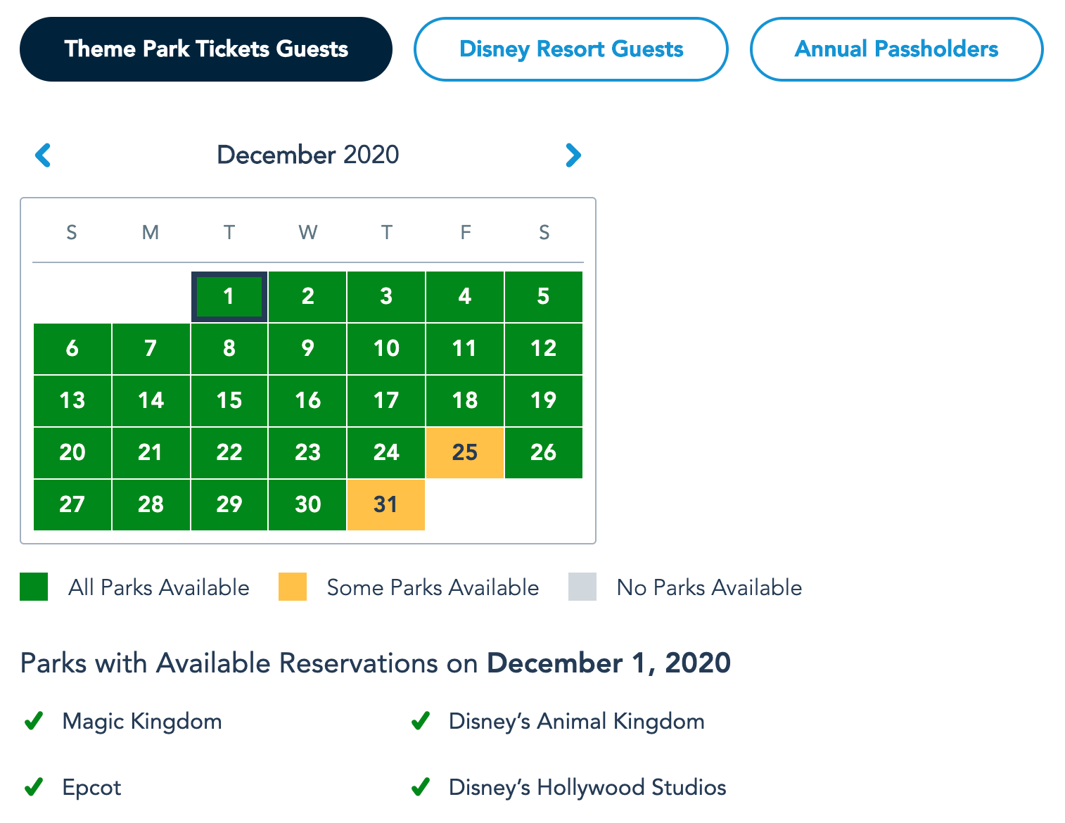 For Theme Park Tickets Guests and Disney Resort Guests, the only two dates that have limited availability are December 25th in Magic Kingdom and December 31st in Magic Kingdom and EPCOT.