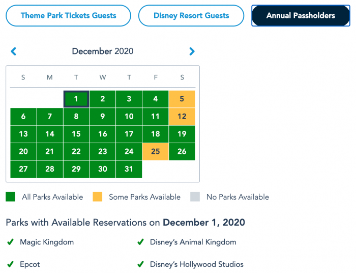 Nothing has been added on the availability front for Passholders. Magic Kingdom is still unavailable on Christmas Day and EPCOT has filled for the first two Saturdays of the month — probably due to the EPCOT International Festival of the Holidays.