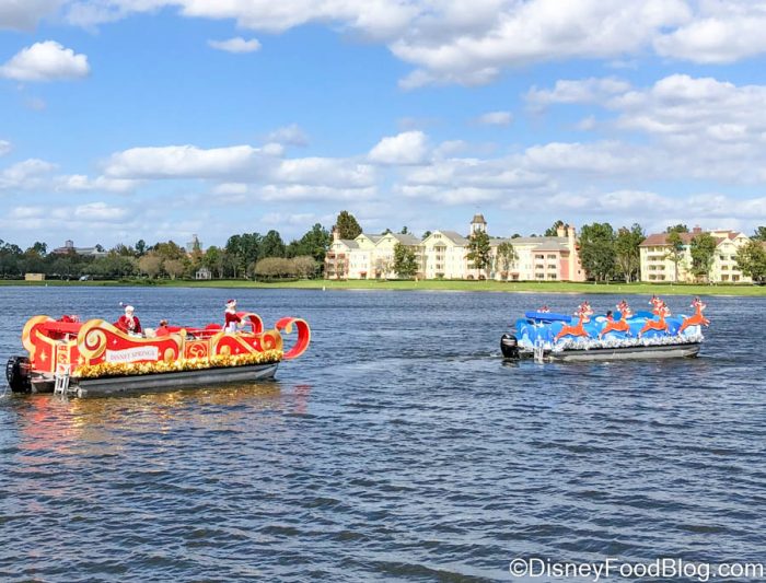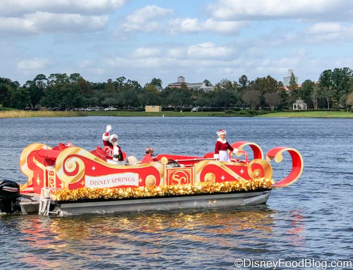 Today we were just strolling along through Disney Springs when we saw this merry sight! It’s Santa and Mrs. Claus on a boat!
