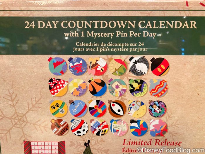 This new World of Disney Holiday Countdown Calendar Pin Set is available both in Disney World and online. We spotted it yesterday in Animal Kingdom’s Discovery Trading Co, and it’s a fun twist on a traditional advent calendar!