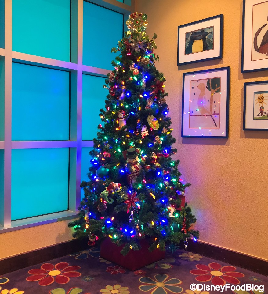 Of course, the star of any Disney resort’s holiday decor is the TREE, and Art of Animation has a towering white pine tree with brightly colored bulbs and artwork sketches, playing into the lobby’s theme of seeing concept art turned into fully animated scenes!