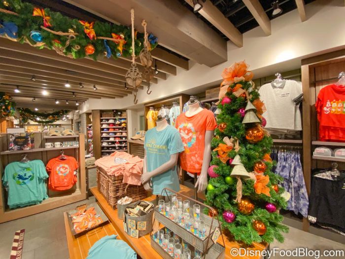 As we mentioned on our last trip, the decking of the halls extends to the Calypso Trading Post — the Resort’s merchandise location. This spot opts to play up the orange in the color scheme.