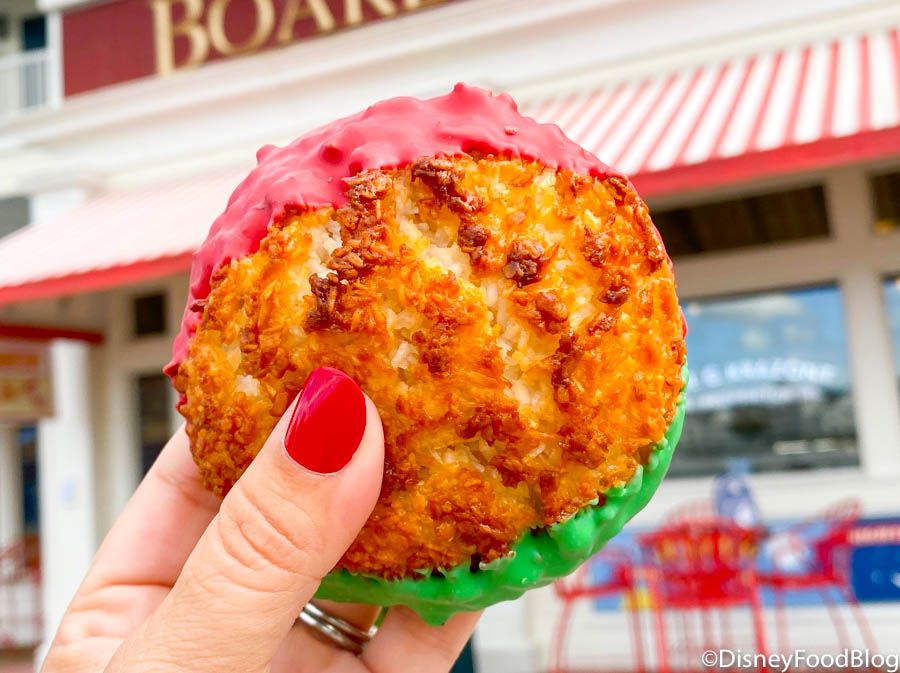The Holiday Macaroon is a VERY large coconut macaroon (not to be confused with a macaron — the French almond cookies you can find nearby in EPCOT) with the bottom dipped in green and red white chocolate.