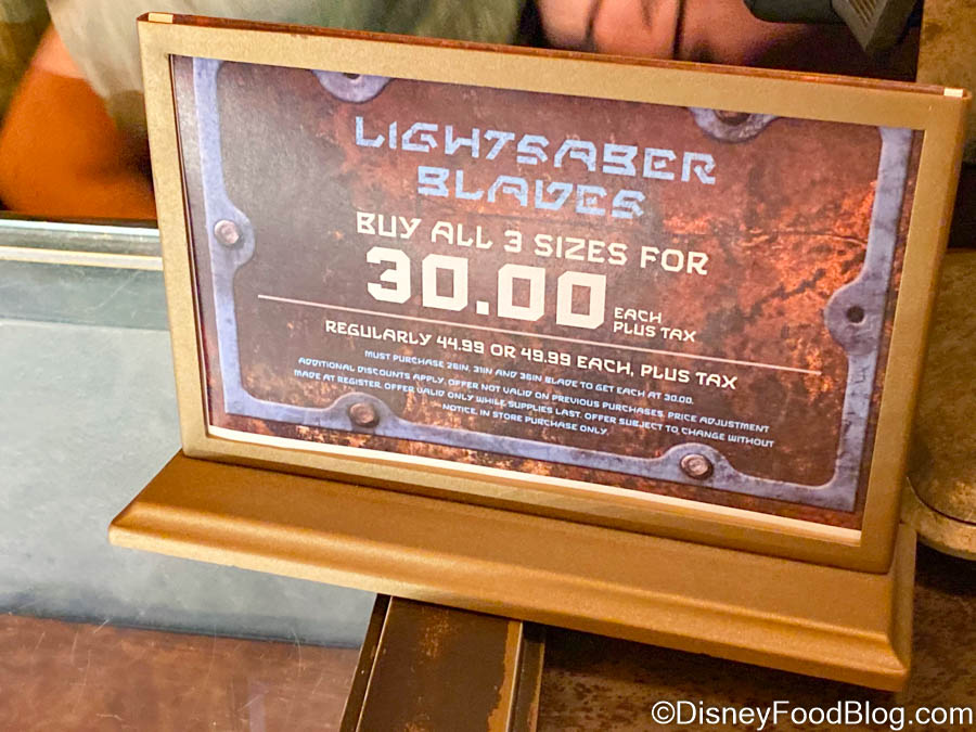 We popped into Dok Ondar’s to see what was new and we found a BIG sale on Lightsaber Blades! A sign posted on the counter alerted us that you could buy all three sizes of lightsaber blades for $30 each (they’re normally $44.99 or $49.99).