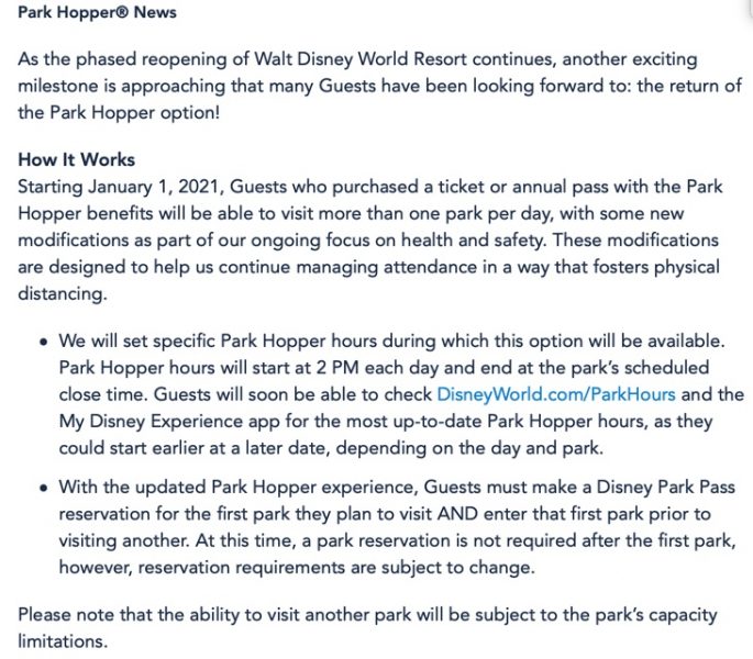 Note that Park Hopping to each park will still be limited by the parks’ capacity limitations.