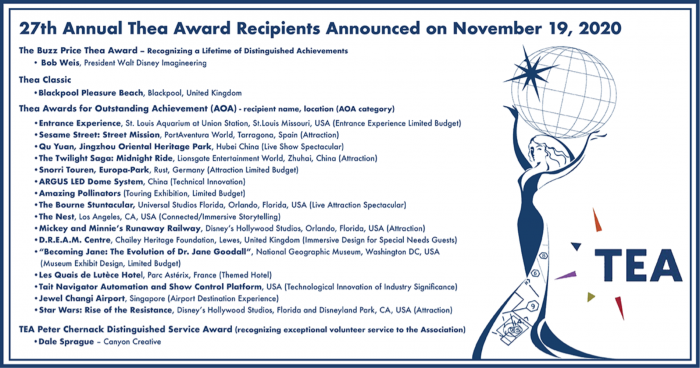 Themed Entertainment Association, or “TEA”, recognizes theme parks, exhibitions, and themed experiences around the world each year with their annual Thea Awards. These awards represent “excellence, innovation and leadership in the creation of compelling places and experiences.”