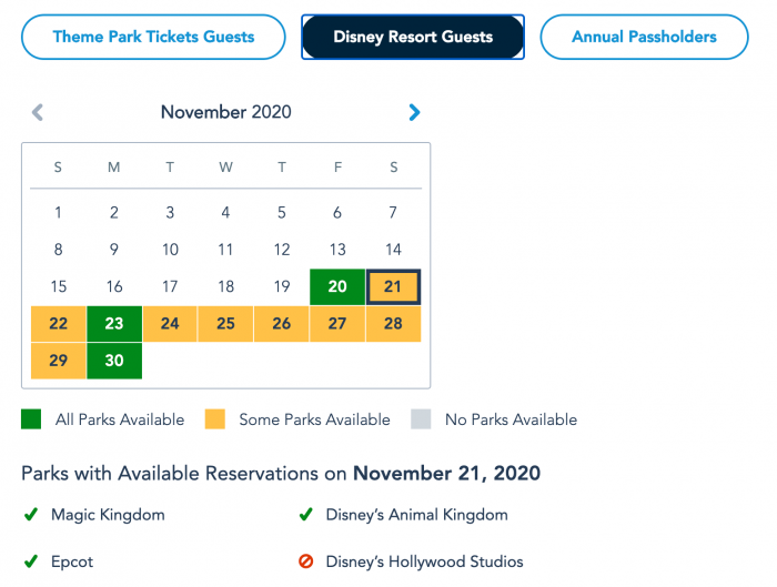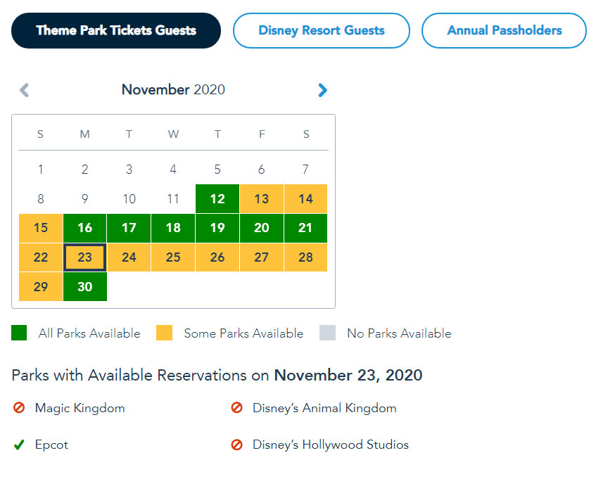 Hollywood Studios is booked up for all but three days through November 30th, but every other park is available every day through the end of the month for these ticket groups.