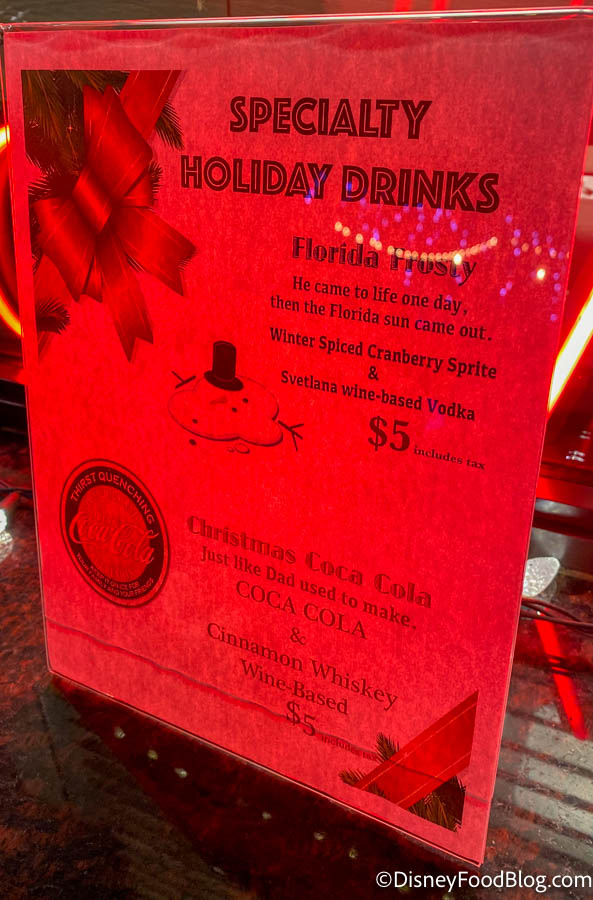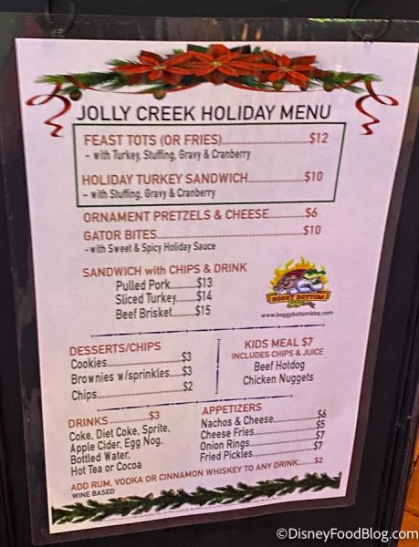 Now for one of the things that’s most important to us — FOOD! They offer a holiday-themed menu, including items like Ornament Pretzels & Cheese and a Holiday Turkey Sandwich.