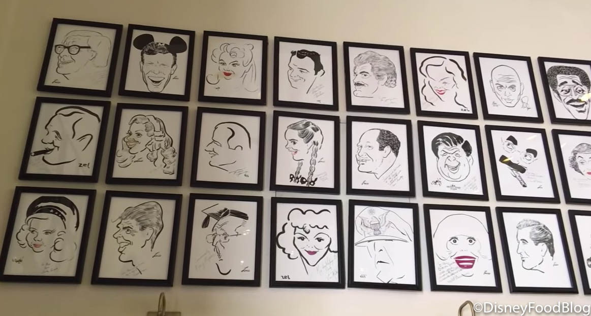 One of the most notable decor elements around the restaurant is the eye-catching black and white photos lining the walls of the lobby and dining area. Back in the day in the REAL Hollywood Brown Derby, resident caricature artists would entertain celebrity diners by sketching their likeness. The most notable of these artists were Jack Lane and an artist named Vitch. Celebrities pictures would be added to the walls around the Derby as a sort of “Great Wall of Hollywood Fame” and by the time the restaurant closed in 1985, the walls were covered in drawings of famous patrons. The ones seen in the Disney World Derby? Most are recreations of the originals…but not all.