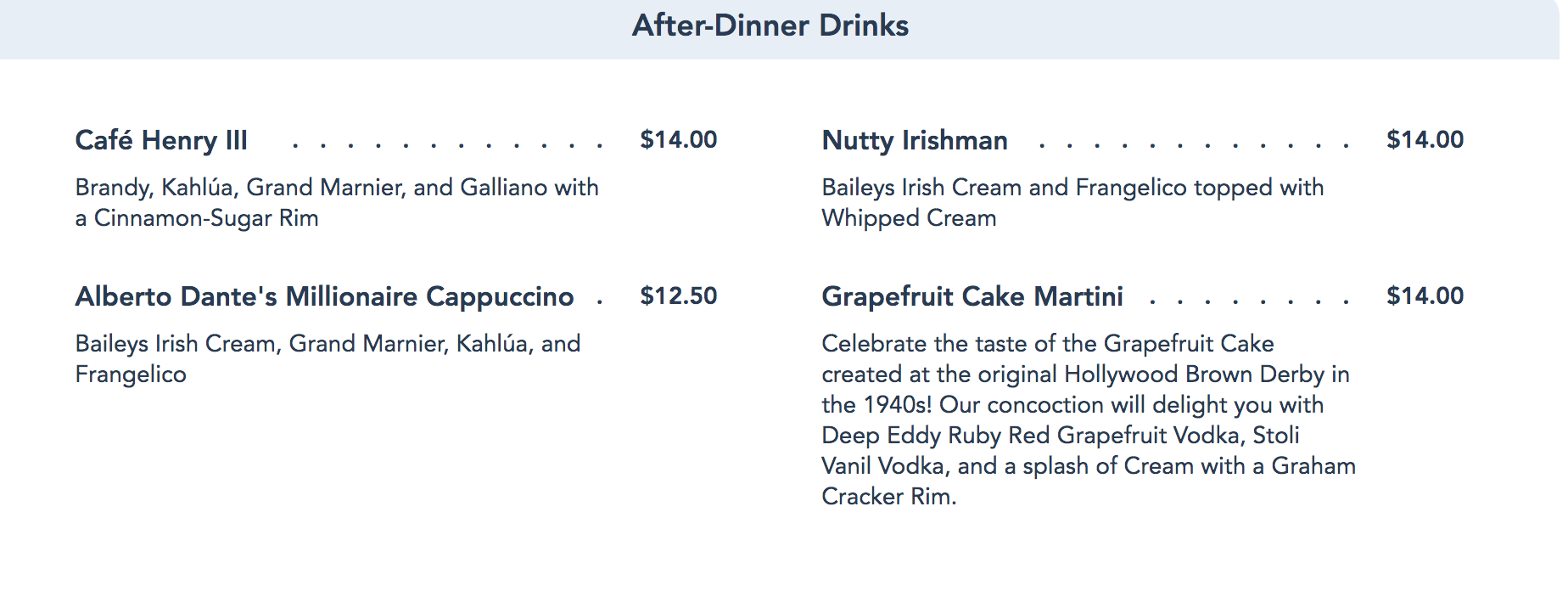 After all the swanky cocktails and classic desserts, it was time for an after-dinner drink. There’s something about the vibe at Brown Derby that makes us want to finish our evening with a nightcap. The Cafe Henry III is coffee mixed with Brandy, Kahlúa, Grand Marnier, and Galliano with a Cinnamon-Sugar Rim for $14.