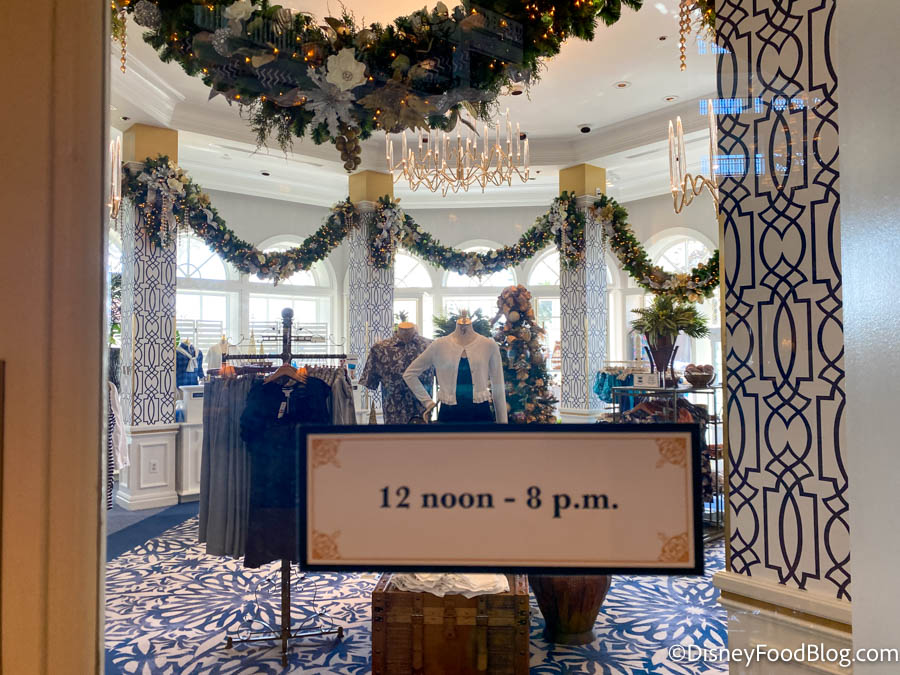 We also spotted some hours posted outside one of the resort’s shopping locations, Curiouser Clothiers.