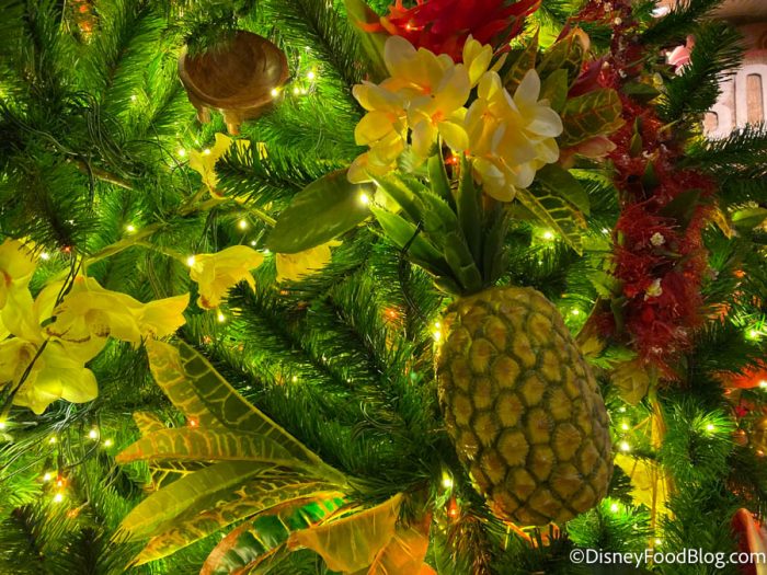 The Christmas tree is filled with tropical touches, like these bright flowers and a PINEAPPLE!