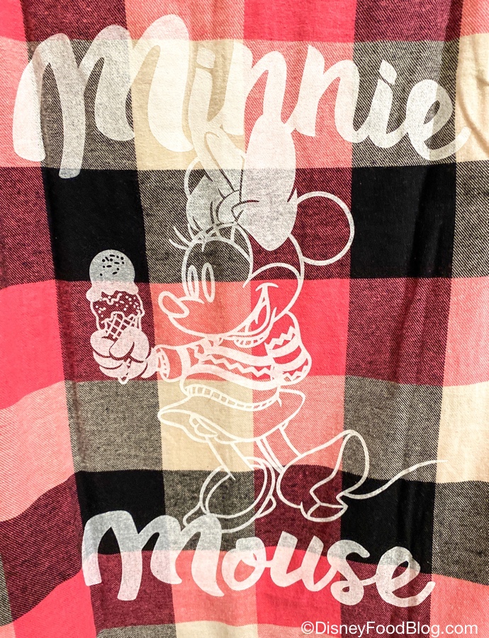 Her colorful flannel shows a smiling Minnie over the front pocket, while the back has her showing off a sweater and a huge bow! She’s also got a double-scooped cone of ice cream, because clearly ice cream weather is YEAR ROUND.