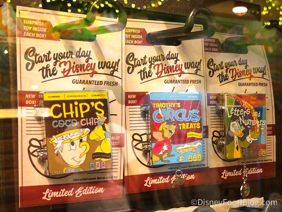We spotted the Limited Edition Cereal Box pins we’ve seen throughout the parks and resorts. We found three to the set: Chip’s Coco Chips, Timothy’s Circus Treats, and Professor Von Drake’s Letters and Numbers!