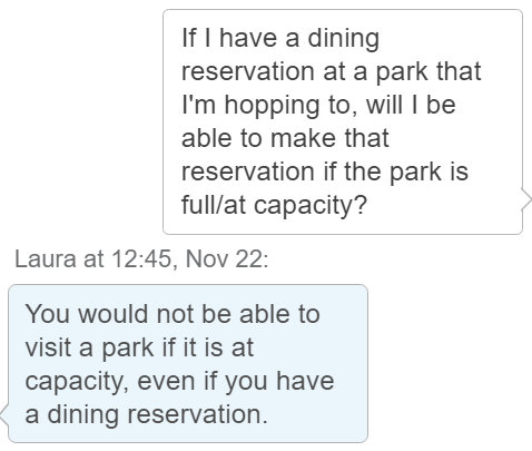 3. However, later, a different Cast Member stated the opposite via chat: that a dining reservation would DEFINITELY guarantee park entry when park hopping. When asked the question, the Cast Member said, “yes, it does.”