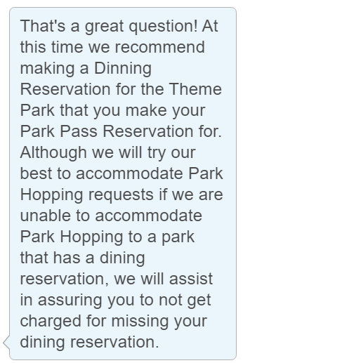 5. OK with three out of four Cast Members saying NO, we decided to chat with one more Cast Member just in case. This CM suggested we only make dining reservations at parks that we have park pass reservations for. And we did receive confirmation that if a guest misses a dining reservation because of a full park, no charges will be incurred.