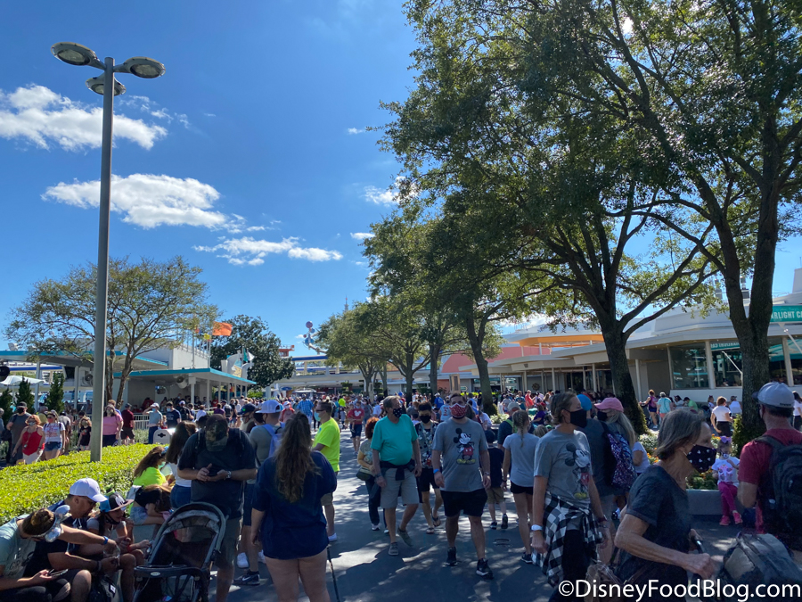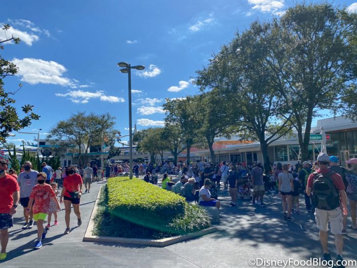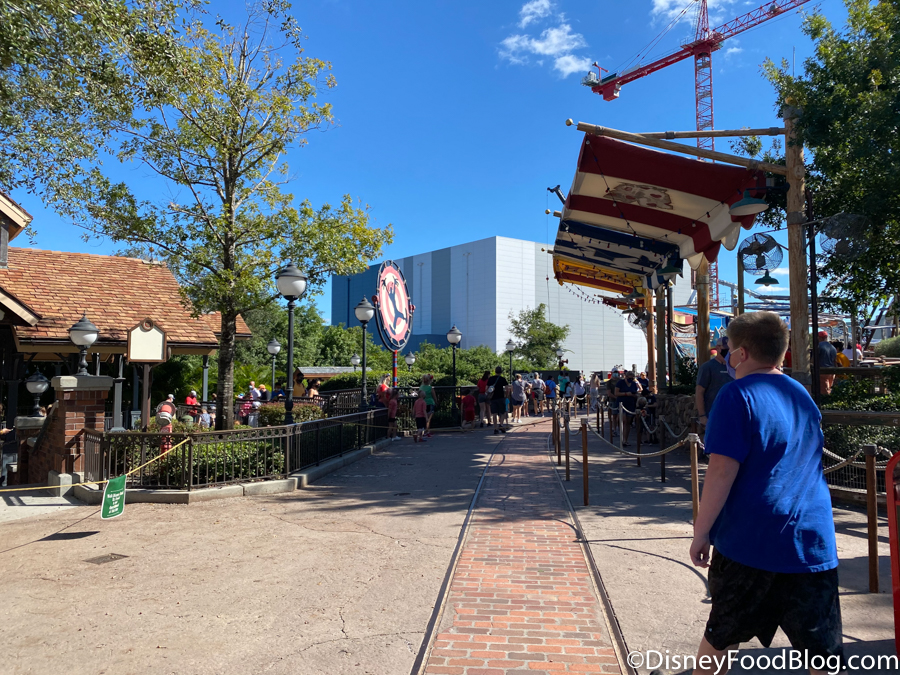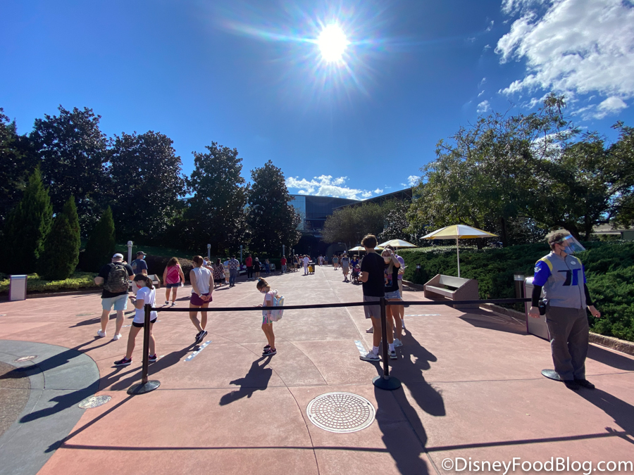 It should also be noted that due to the varying ride capacities (adjusted by physical distancing), some rides can board more passengers than others. This can cut down on wait times considerably. The queue for Spaceship Earth extended outside the attraction and alongside the building.