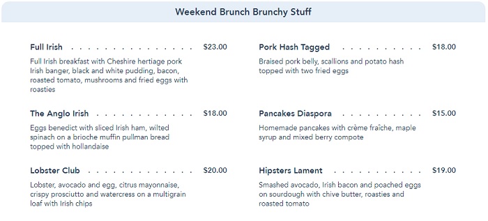 Let’s look at brunch first. Two starters, The Rack of Heaven ribs and Scallop Forest, have each gone up $2 to $31 and $20, respectively. But the price increases don’t stop there. The Pork Hash Tagged and The Anglo Irish Eggs benedict have each gone up $1, now costing $18 a dish. The Hipsters Lament, essentially a fancy avocado toast, also went up a buck, now costing $19. Sweet brunch fans are not spared. The Pancakes Diaspora have also seen the same increase, now costing $15.