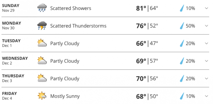 On November 30th, we see a pretty dramatic drop in temperature! The high for the day is expected to be around 73 degrees, with a high chance of rain — all the way at 60%.