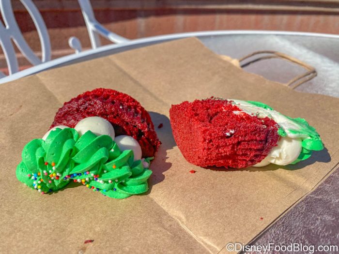 Over at Gasparilla Island Grill at Disney’s Grand Floridian Resort & Spa, the Red Velvet Wreath Cupcake is back for the holiday season!