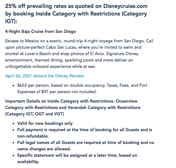 You can also save 25% off prevailing rates quoted on Disneycruise.com by booking an Inside Category with Restrictions room on a 4-night Baja Cruise from San Diego.