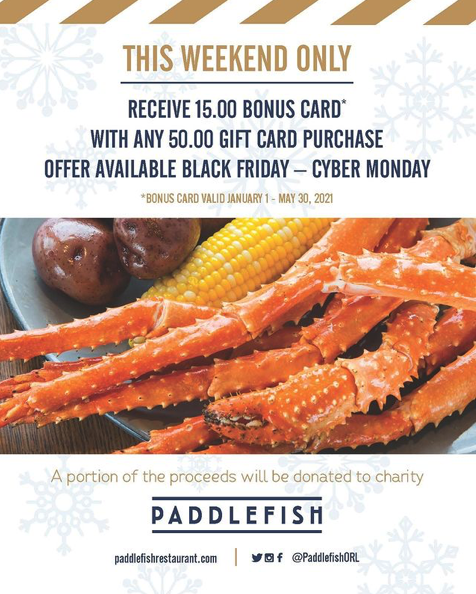This weekend only (Friday, November 27th through Monday, November 30th) you can actually get a BONUS $15 gift card for Paddlefish when you purchase $50 in gift cards for Paddlefish online.