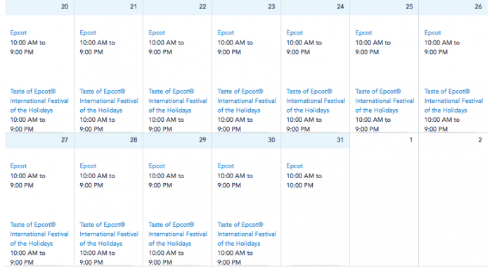 - December 4th-6th, 11th-13th, 18th-19th: the park will now be open from 8AM-8PM (previously 8AM-6PM)