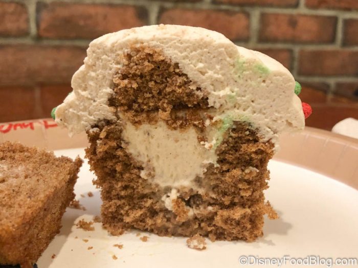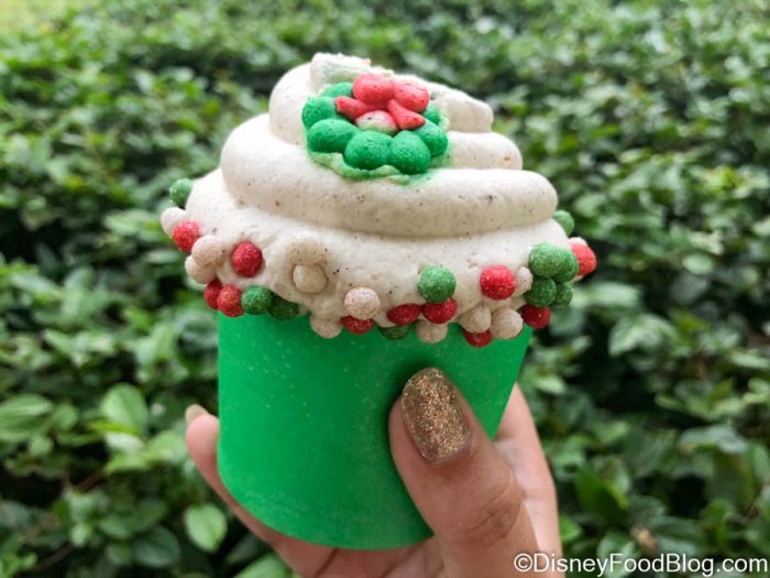 Holiday cupcakes are especially fun! This season we’ve had a peppermint cupcake, a cupcake with a hidden Mickey, an Olaf cupcake, and a red velvet wreath cupcake, to name a few. We’re pretty much always down to try a new cupcake, and today we tried an eggnog one!