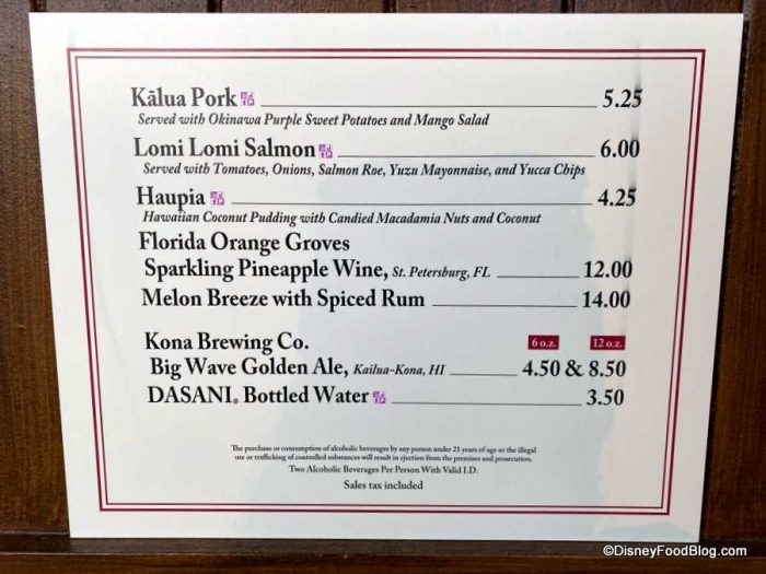 But, before we get to eating, let’s talk about the drinks here. There are a few alcoholic drinks available at this booth including the NEW Melon Breeze with Spiced Rum, Kona Brewing Co. Big Wave Golden Ale, Kailua-Kona, HI (which has been served at EPCOT festivals for a while); and Florida Orange Groves Sparkling Pineapple Wine, St. Petersburg, FL, another returning beverage from other EPCOT festivals which is quite refreshing on a hot Florida day!
