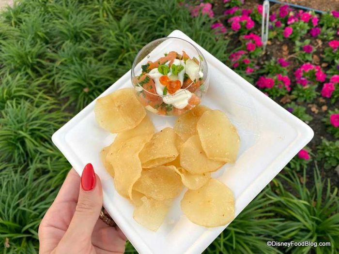 Next up was the Lomi Lomi Salmon for $6. This is served with tomatoes, onions, salmon roe, Yuzu mayonnaise, and Yucca chips. We thought this was delicious, but felt like the portion size was a little small — yes, most portion sizes are small at the Festival, but this one still felt TOO small for the price. The chips were great, though — very crispy!