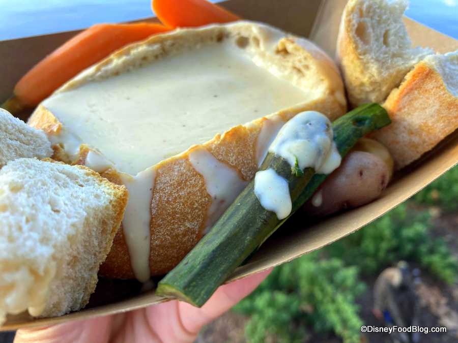 First up, we gave the Cheese Fondue in a Bread Bowl with Steamed Baby Vegetables and Marble Potatoes for $8.25 a try and, we’ll tell ya, it’s not hard to get us to fall in love with a doughy bowl full of liquid cheese.