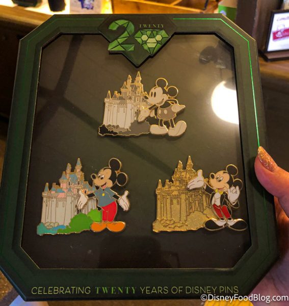 Disney held a virtual pin trading event earlier this month to celebrate the anniversary. While hanging out in Magic Kingdom today, we stopped into Frontier Trading Post and spotted two different pin sets commemorating the occasion! This one celebrates 20 Years of Pins with different variations of Mickey Mouse in front of the castle over the years.