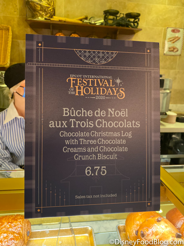 We’ve been busy trying all the new treats and sweets at each Holiday Kitchen in World Showcase. Now, other EPCOT locations have joined in the festivities! Les Halles Boulangerie Patisserie bakes up some beautiful desserts and French pastries throughout the year. The bakery is currently serving a traditional Bûche de Noël aux Trois Chocolats for the season!