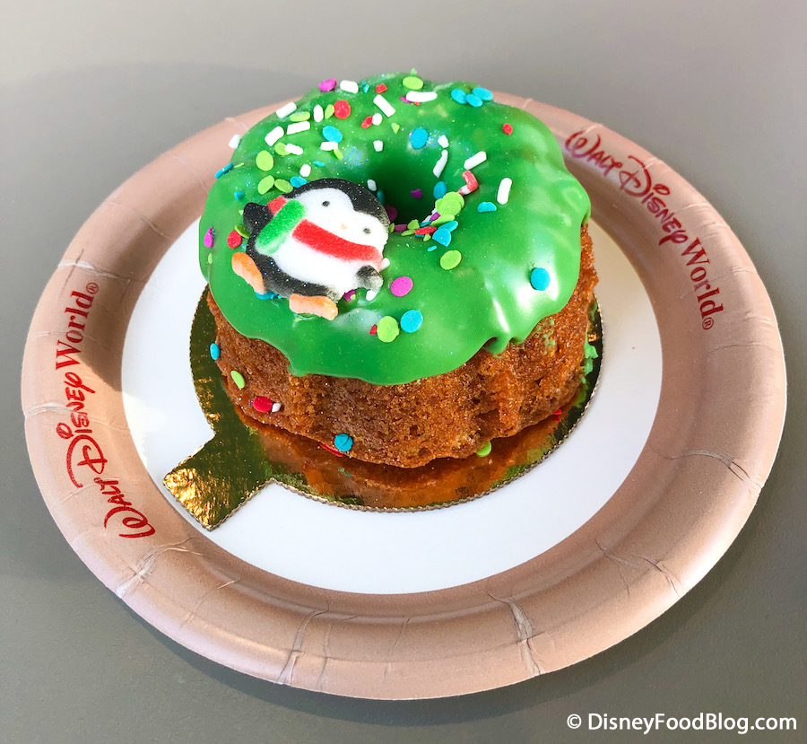 …made with ginger-spice muffin batter cake, lemon-flavored icing, sprinkles, edible glitter, and a festive penguin candy piece for $4.49.